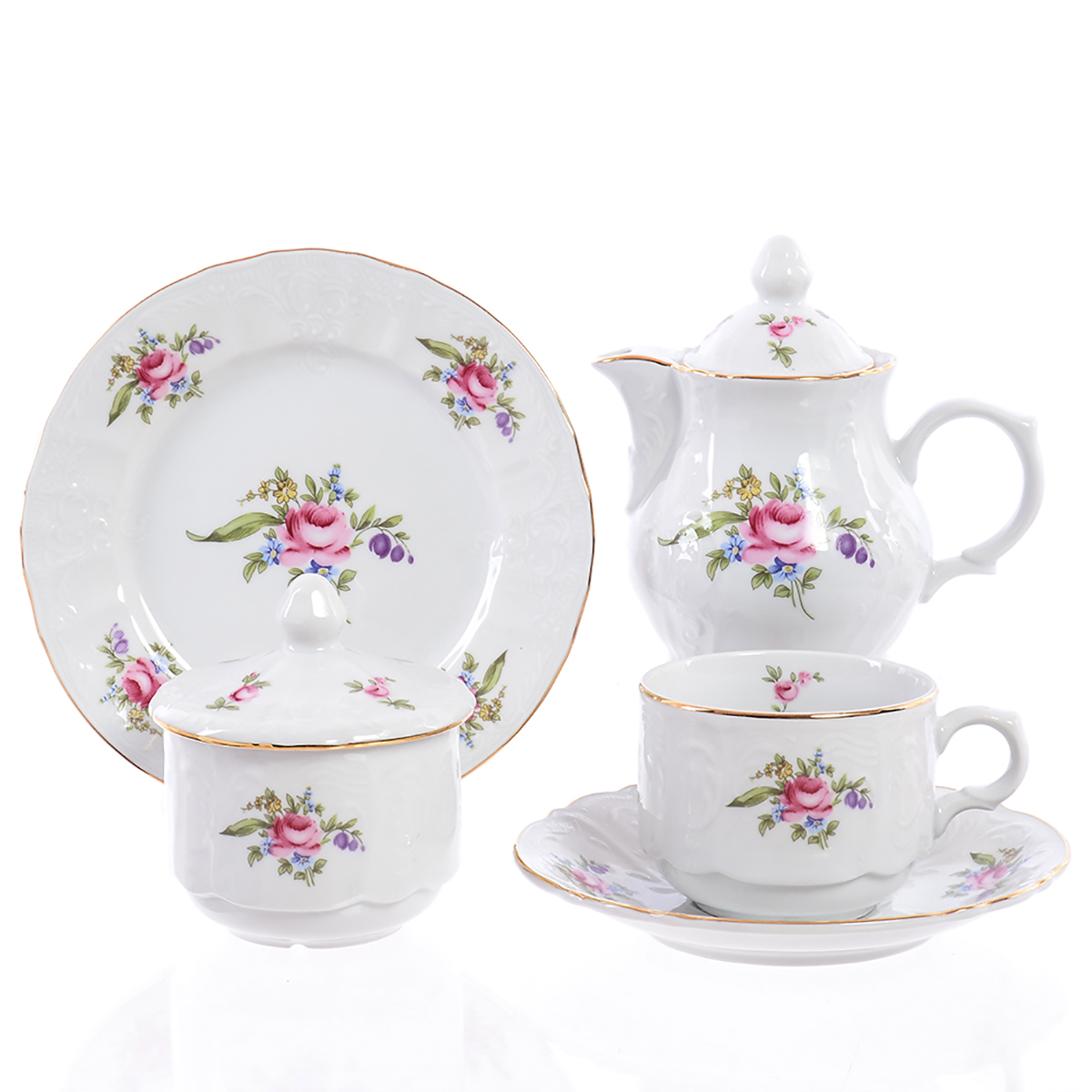 - Состав набора чашка 220 мл - 6 шт; блюдце 17 см - 6 шт; сахарница 300 мл с крышкой - 1 шт; тарелка десертная 19 см - 6 шт; чайник 1,2 л с крышкой - 1 шт.