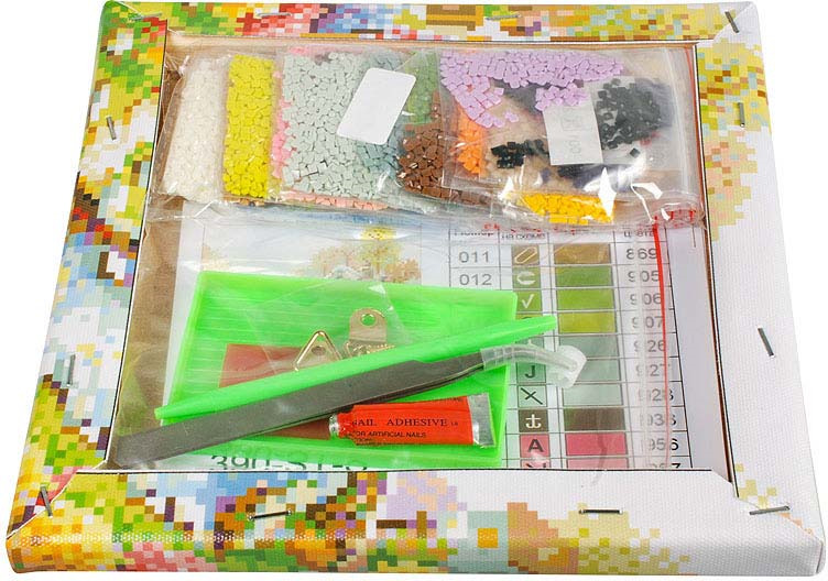 - Комплектация холст на подрамнике с листом оргалита, пинцет, пластмассовый лоток для камней, набор пластиковых камней (страз), жидкий клей