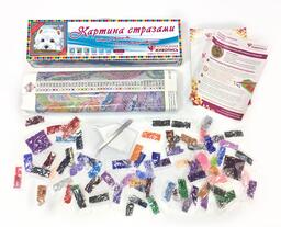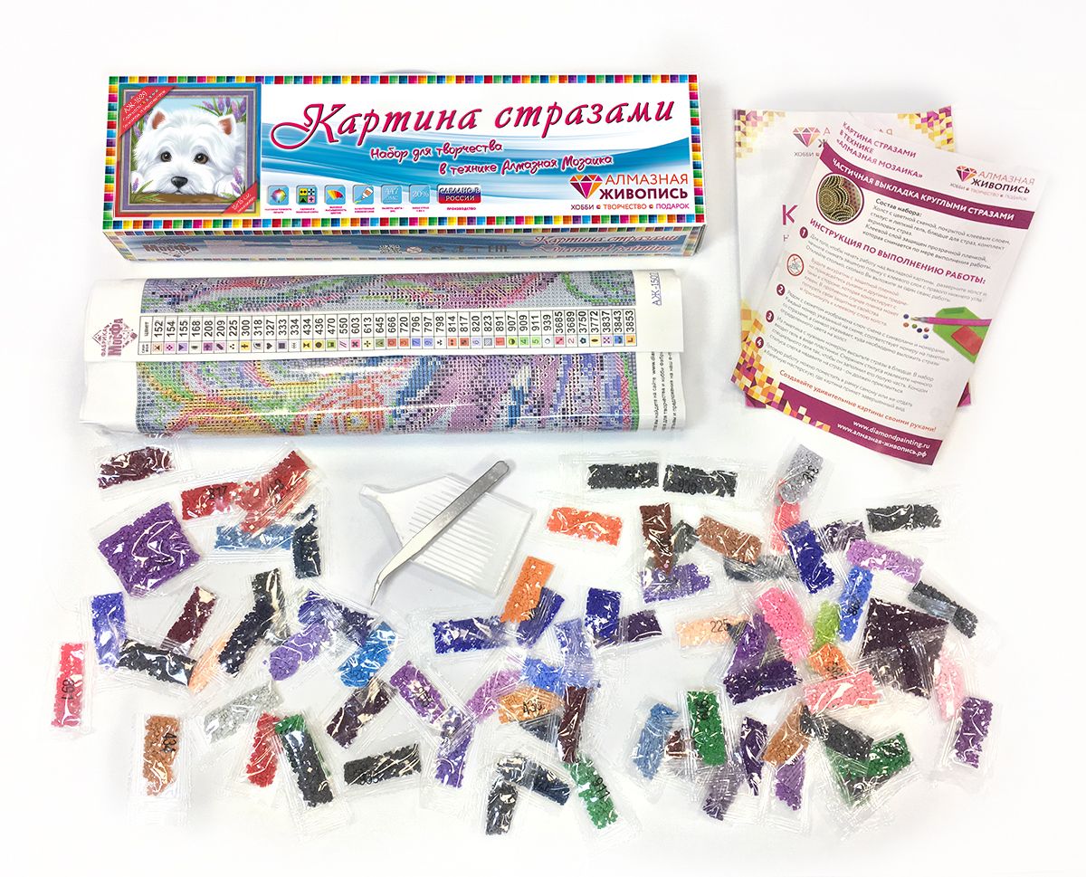 - Комплектация Холст с цветной схемой, пинцет или стилус, лоток для стразов, комплект квадратных стразов, инструкция по работе