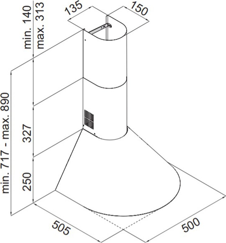 Настенная, купольная кухонная вытяжка, ширина 50 см, тип очистки воздуха: рециркуляция, отвод, количество скоростей 3, макс производительность 240 м3/ч, ползунковое управление, металлический жироулавливающий фильтр, угольный фильтр приобретается дополнительно, макс уровень шума 64 дБ.