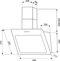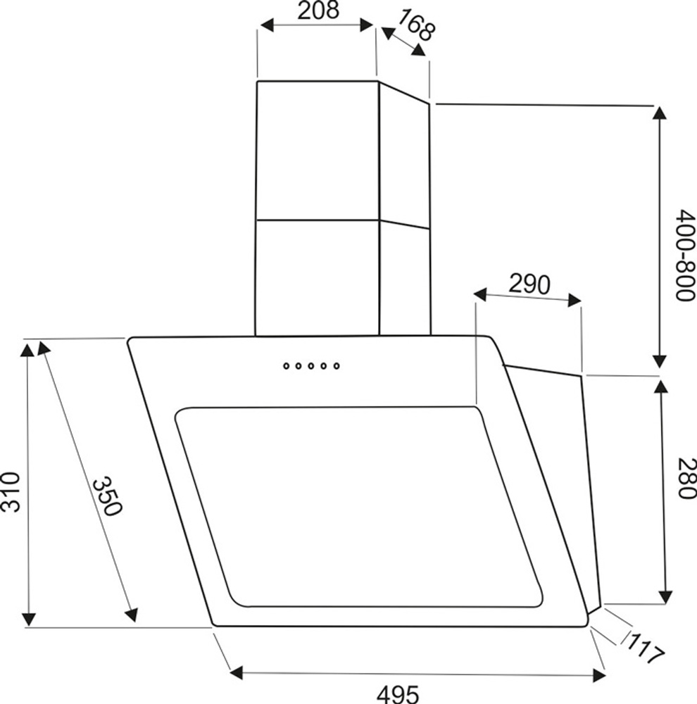 Настенная, наклонная кухонная вытяжка, ширина 49.5 см, тип очистки воздуха: отвод, рециркуляция, количество скоростей 3, макс производительность 600 м3/ч, кнопочное управление, металлический жироулавливающий фильтр, угольный фильтр приобретается дополнительно, макс уровень шума 42 дБ.