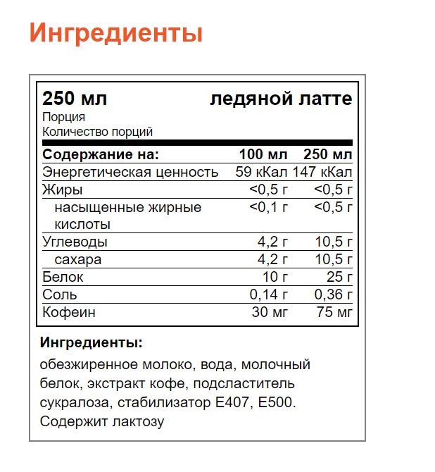 - Прочие ингредиенты, в порции обезжиренное молоко, вода, молочный белок, экстракт кофе, подсластитель сукралоза, стабилизатор Е407, Е500. Содержит лактозу