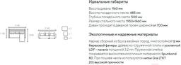 • Материал каркаса дерево (брус хвойных пород: влажность 8 – 10%); массив), ДСП (класс эмиссии Е1), ДВП (толщиной 3,2 мм), фанера (многослойная березовая, 12 мм; класс эмиссии Е1), пластик (с проризиненным подпятником)