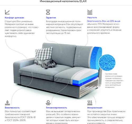 • Материал каркаса дерево (брус хвойных пород: влажность 8 – 10%), ДСП (класс эмиссии Е1), ДВП (толщиной 3,2 мм), фанера (многослойная березовая, 12 мм; класс эмиссии Е1), пластик (с проризиненным подпятником)