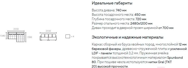 • Материал каркаса дерево (брус хвойных пород: влажность 8 – 10%), ДСП (класс эмиссии Е1), ДВП (толщиной 3,2 мм), фанера (многослойная березовая, 12 мм; класс эмиссии Е1), пластик (с проризиненным подпятником)