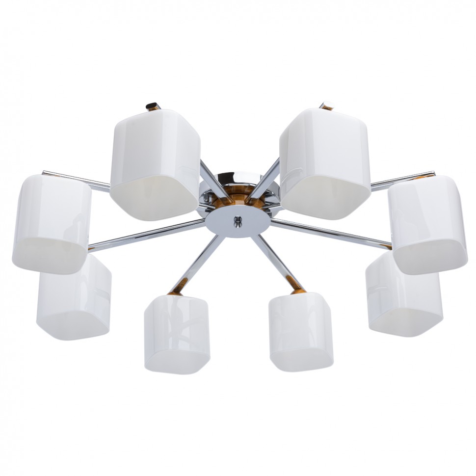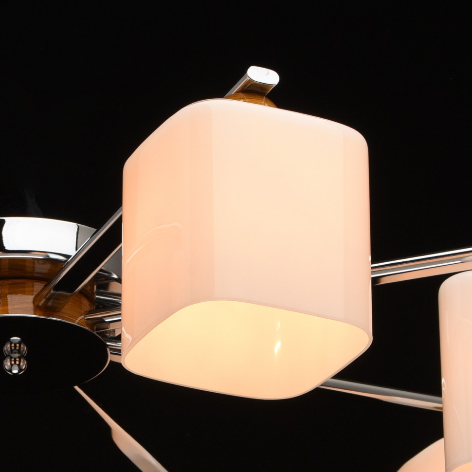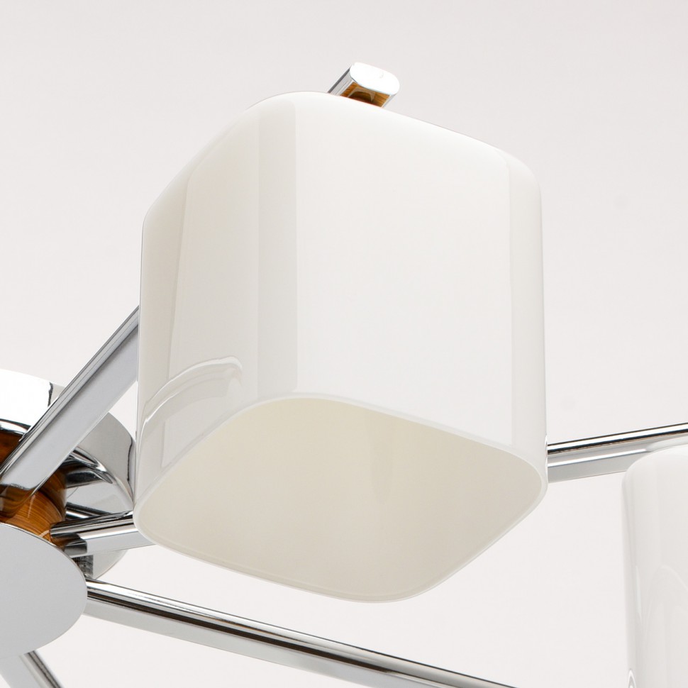 ДополнительноМеталлическое основание цвета хрома. Стеклянные плафоны белого цвета. Декор - имитация дерева.