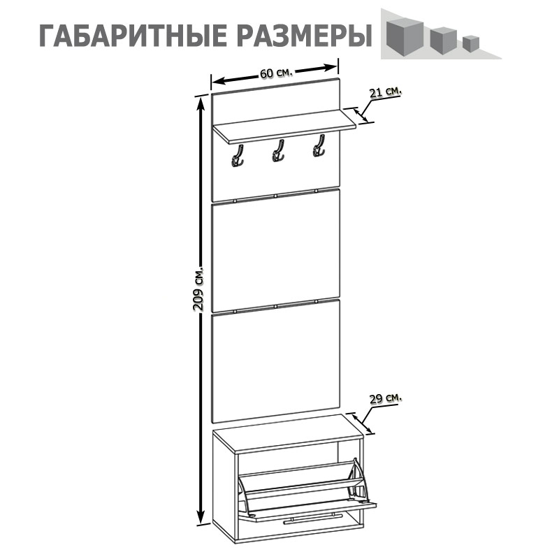 - Размеры (ШxГxВ), в сантиметрах 60х29х209
