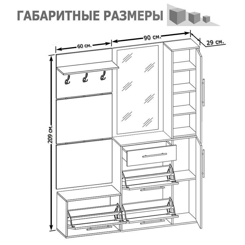 - Размеры (ШxГxВ), в сантиметрах 150х29х209