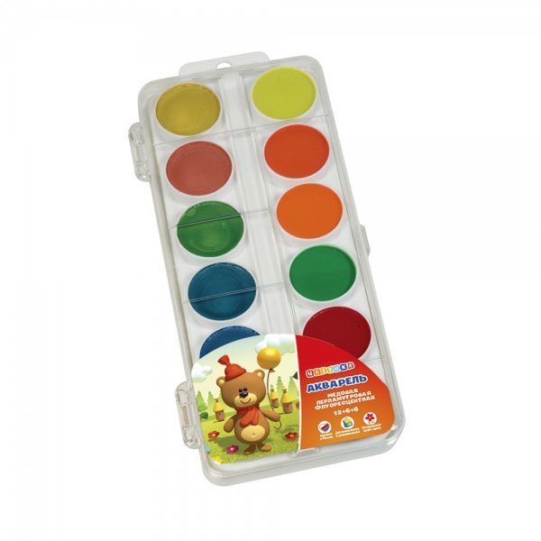 Набор акварельных медовых красок для детского творчества, 24 цвета в пластиковой упаковке (акварель 12 цветов, акварель перламутровая 6 цветов, акварель флуоресцентная 6 цветов). Краски созданы специально для детей, отличаются яркостью и чистотой цвета.