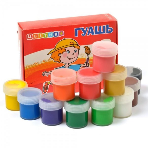 Набор гуашевых красок для детского творчества и декоративно-оформительских работ, 12 цветов в банках по 20 мл. Краски отлично наносятся на бумагу и картон, легко размываются водой. При высыхании приобретают матовую, бархатистую поверхность. Перед применением краску необходимо перемешать.