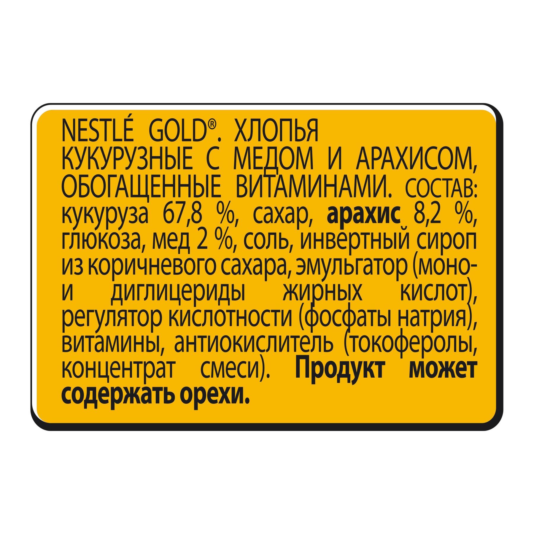 - Состав Кукурузная крупа 67.8%, сахар, арахис 8.2%, глюкоза, мед 2%, соль, инвертный сироп из коричневого сахара, эмульгатор (моно и диглицериды жирных кислот), регулятор кислотности (фосфаты натрия), витамины, антиокислитель (токоферолы, концентрат смеси). Продукт может содержать орехи.
