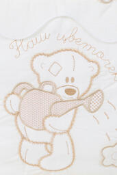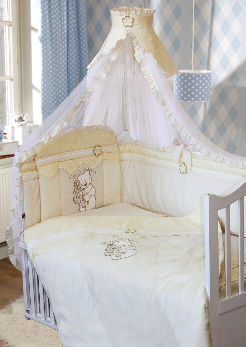 - Комплектация: Состав комплекта: - балдахин-сетка с оборкой и верхней частью - 1,5х4,5 - одеяло стеганное - 1,05х1,4 - пододеяльник с аппликацией и вышивкой на внешней стороне - 1,05х1,44 - подушка - 0,35х0,57 - наволочка - 0,39х0,59 - бампер из 4 частей с завязками и отстрочкой - 0,38х3,56 - простыня (на резинке) - 0,68х1,25