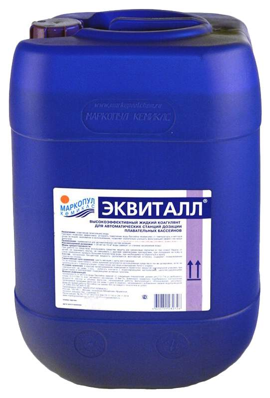 - Способ применения перед проведением коагуляции следует проверить и при необходимости довести до нормы значения рН (7,0-7,4) и свободного хлора (0,3-0,6 мг/л), 90 - 180 мл "Эквиталла" очень медленно вливают в скиммер при работающем циркуляционном насосе, после чего необходимо выключить насос на 20 мин (для накопления слоя хлопьев), слой хлопьев со дна бассейна удаляют с помощью пылесоса, включают вентиль насоса бассейна на промывку, для автоматических систем дозирования, в зависимости от степени загрязнения воды, рекомендуется 2,5-25 мл Эквиталла на 10 м³ воды