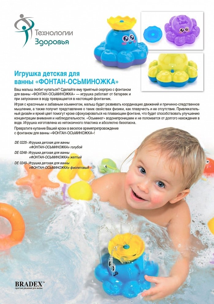ОписаниеХотите, чтобы водные процедуры Вашего малыша превратились в настоящее веселье? С фонтаном для ванны «Осьминожка» Вы сможете устроить мини-аквапарк прямо у себя дома! • Запустив игрушечного осьминога в ванну с водой, Вы получите настоящий мини-фонтан: милое и яркое существо будет плавать рядом с ребенком и аккуратно пускать струи воды. • Эта очаровательная игрушка не только служит отличным развлечением, но и является развивающим элементом в процессе познавания окружающего мира: с мини-фонтаном ребенок узнает о таких физических свойствах, как плавучесть и ее отсутствие, научится концентрировать внимание и фокусировать взгляд, начнет лучше понимать взаимосвязь причин и следствий. • Водонепроницаемый осьминог сделан из безопасного пластика и безвреден.