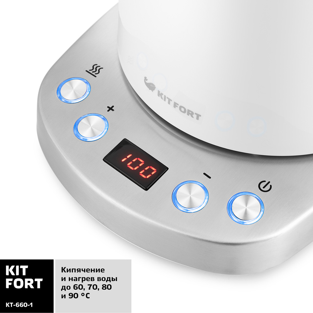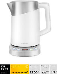 Электрический чайник, мощность 2200 Вт, объем 1.7 л, материал корпуса металл/пластик, нагревательный элемент закрытая спираль, дополнительные функции: дисплей, индикация включения, индикация температуры, поддержание тепла, подставка с вращением на 360°.