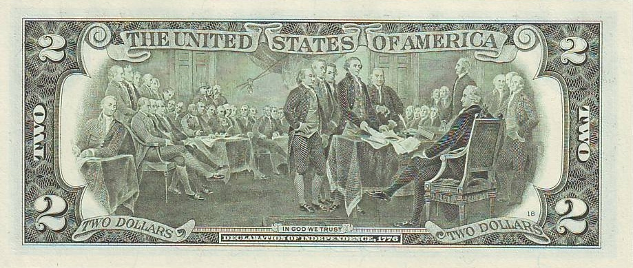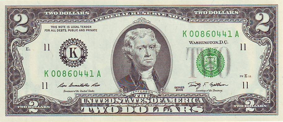 Банкнота США номиналом 2 доллара. Литер K - Даллас, штат Техас. 2009 год. UNC