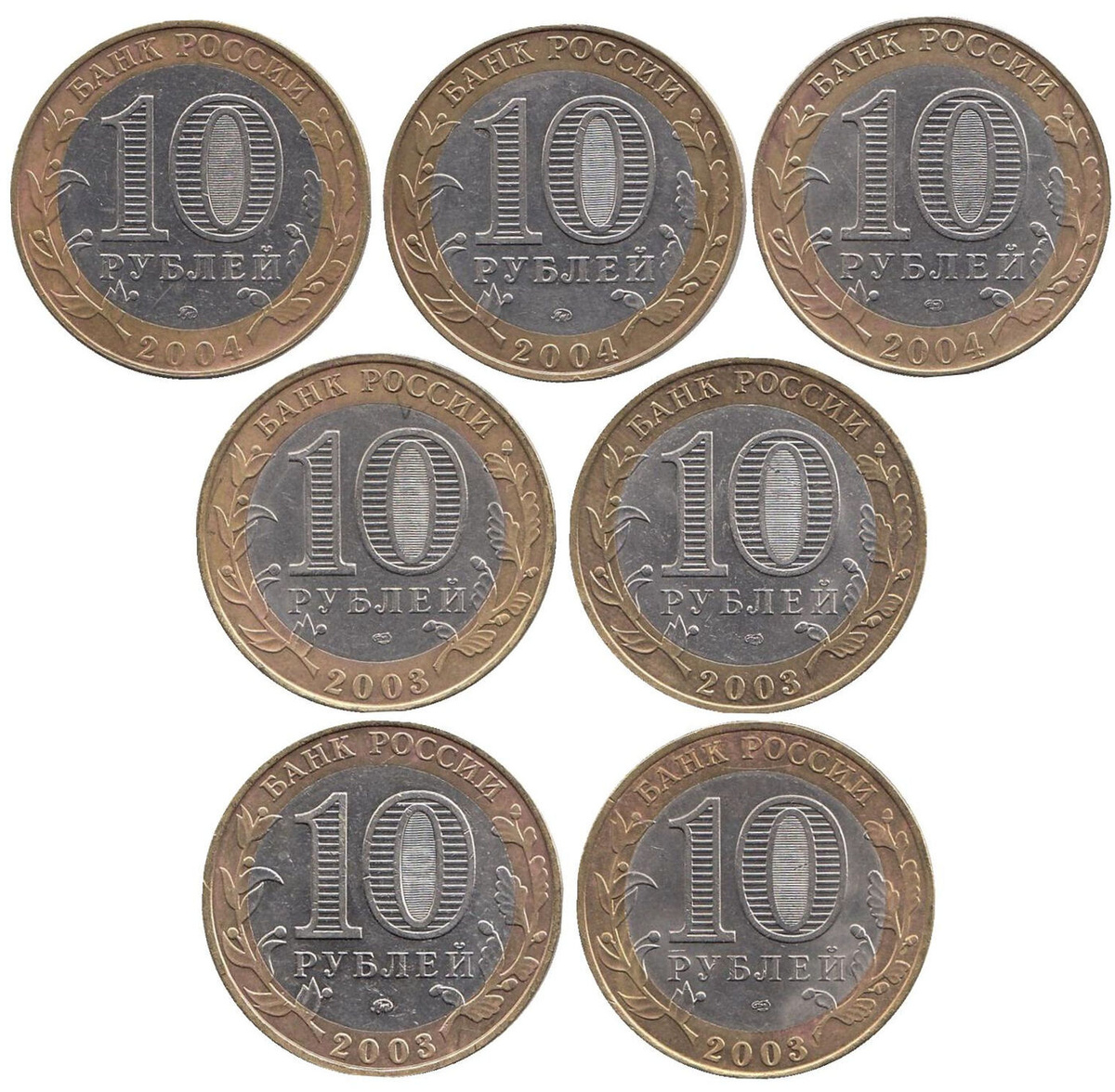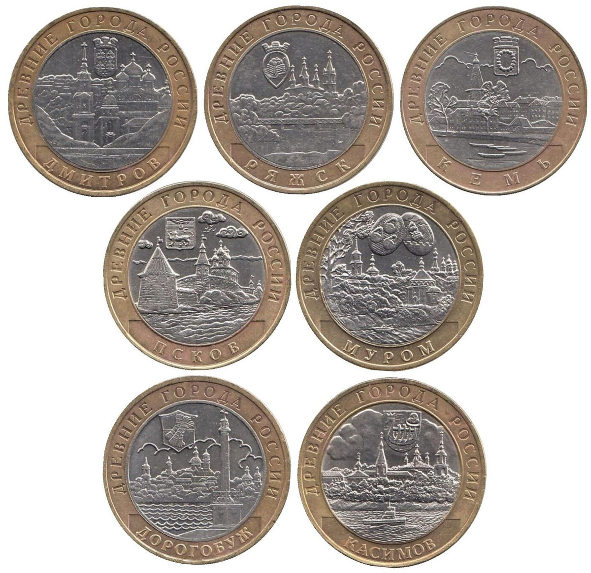 Набор из 7 монет номиналом 10 рублей "Псков, Муром, Дорогобуж, Касимов, Дмитров, Ряжск, Кемь". Древние города России. СПМД, ММД. Россия, 2003-2004 гг.