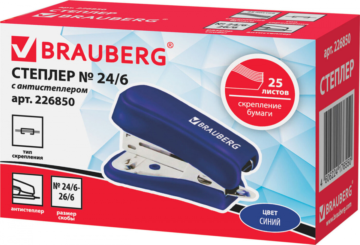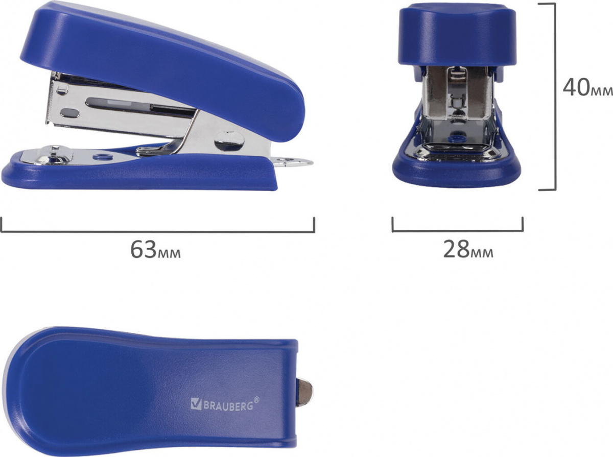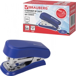 Степлер №24/6, 26/6 МИНИ BRAUBERG "Standard", до 25 листов, с антистеплером, синий, 226850