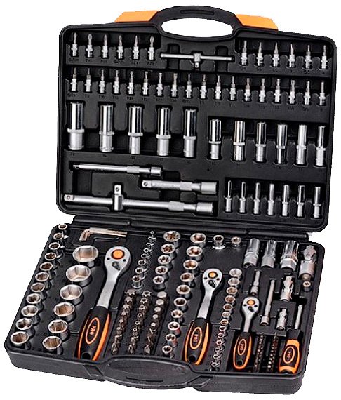 - Наличие в наборе Шестигранные ключи; Удлинители 3/8"; Удлинители 1/4"; Удлинители 1/2"; Трещотка 3/8"; Трещотка 1/4"; Трещотка 1/2"; Торцевые головки 3/8"; Торцевые головки 1/4"; Торцевые головки 1/2"; Отвертка под биты; Головки свечные; Биты
