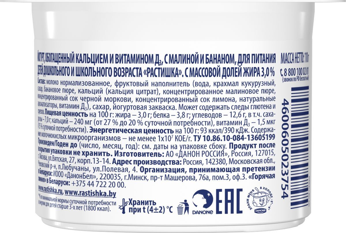 Йогурт Растишка "Малина-банан", 3%, 110 г