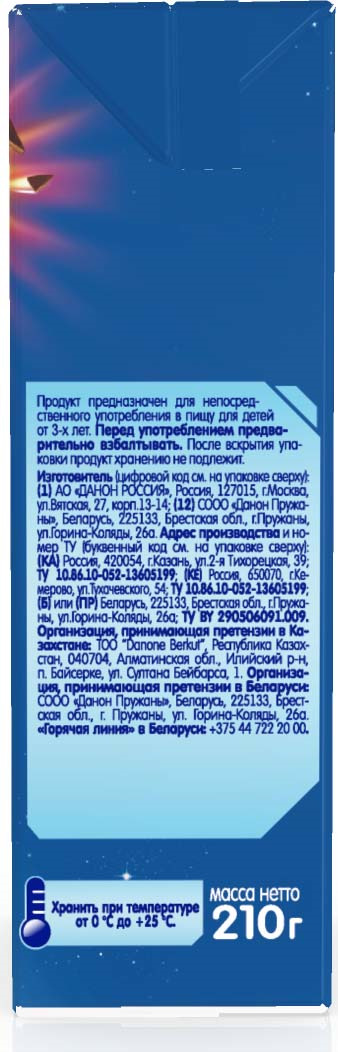 • Состав: цельное молоко, обезжиренное молоко, сахар-песок, молоко сухое обезжиренное, стабилизатор - каррагинан, ароматизаторы натуральные, витаминный премикс (А, D3, Е, В6), краситель - кармин.