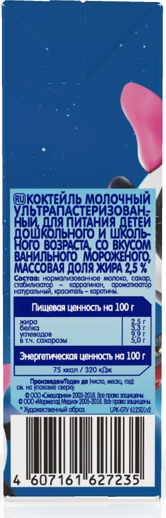 • Состав: цельное молоко, обезжиренное молоко, сахар-песок, молоко сухое обезжиренное, стабилизатор - каррагинан, ароматизаторы натуральные, витаминный премикс (А, D3, Е, В6), краситель - кармин.