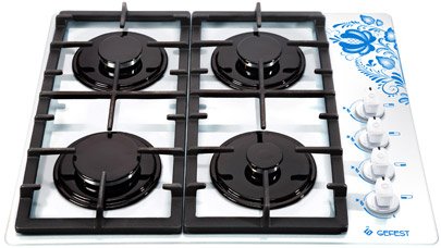Газовая варочная панель, количество конфорок 4, материал поверхности закаленное стекло, управление поворотные переключатели, электроподжиг конфорок автоматический, решетки чугунные, газ-контроль, ширина встраивания 55.4 см.