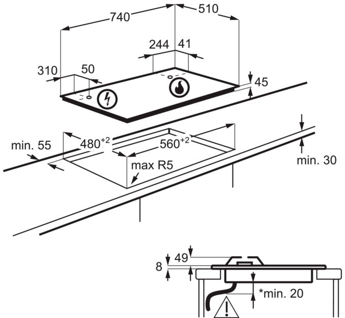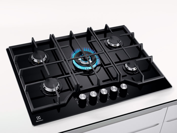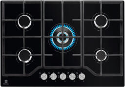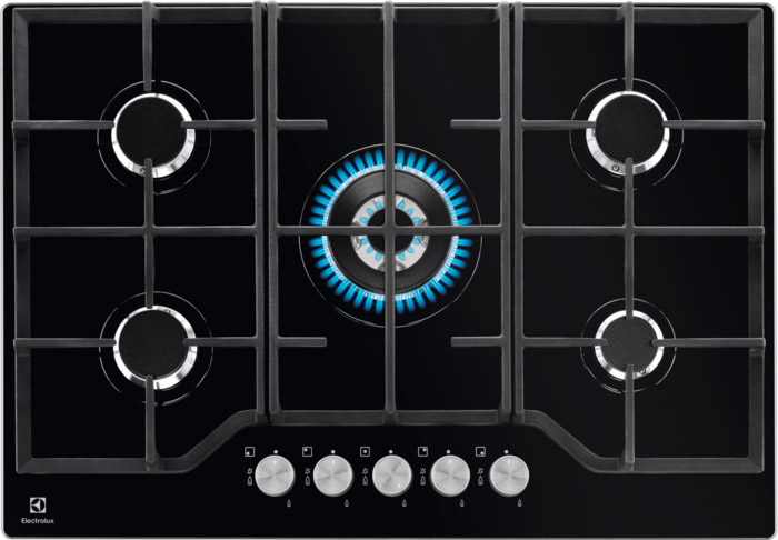 Газовая варочная панель, количество конфорок 5, wOK-конфорка, материал поверхности закаленное стекло, управление поворотные переключатели, электроподжиг конфорок автоматический, решетки чугунные, газ-контроль, ширина встраивания 56 см.