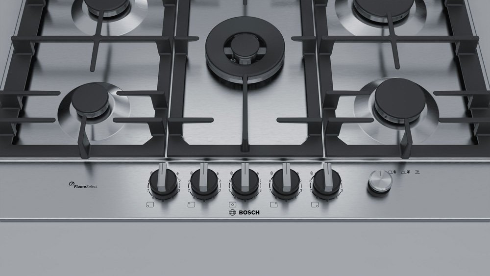 Газовая варочная панель, количество конфорок 5, wOK-конфорка, материал поверхности нерж. сталь, управление поворотные переключатели, электроподжиг конфорок автоматический, решетки чугунные, газ-контроль, ширина встраивания 56 см.
