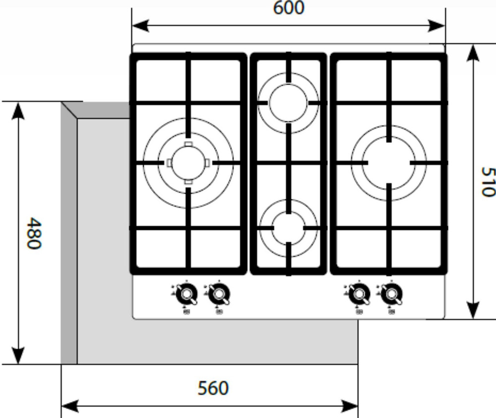 Газовая варочная панель, количество конфорок 4, wOK-конфорка, материал поверхности эмалированная сталь, управление поворотные переключатели, электроподжиг конфорок автоматический, решетки чугунные, газ-контроль, ширина встраивания 56 см.