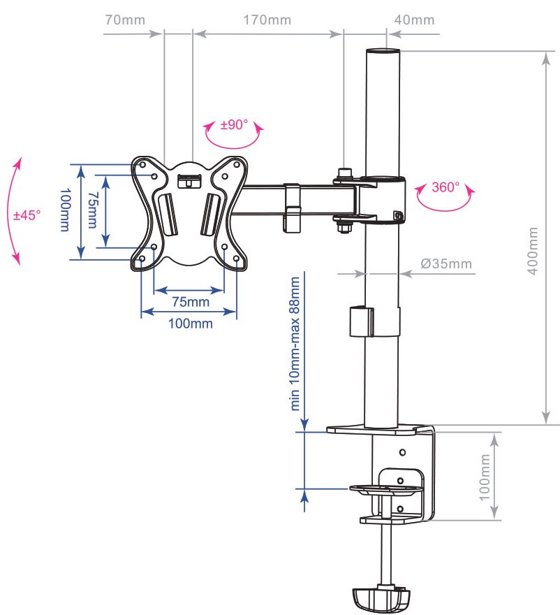Для монитора, установка: столешница, Мин, диагональ: 15 ", Макс, диагональ: 32 ", Поворот , Наклон.