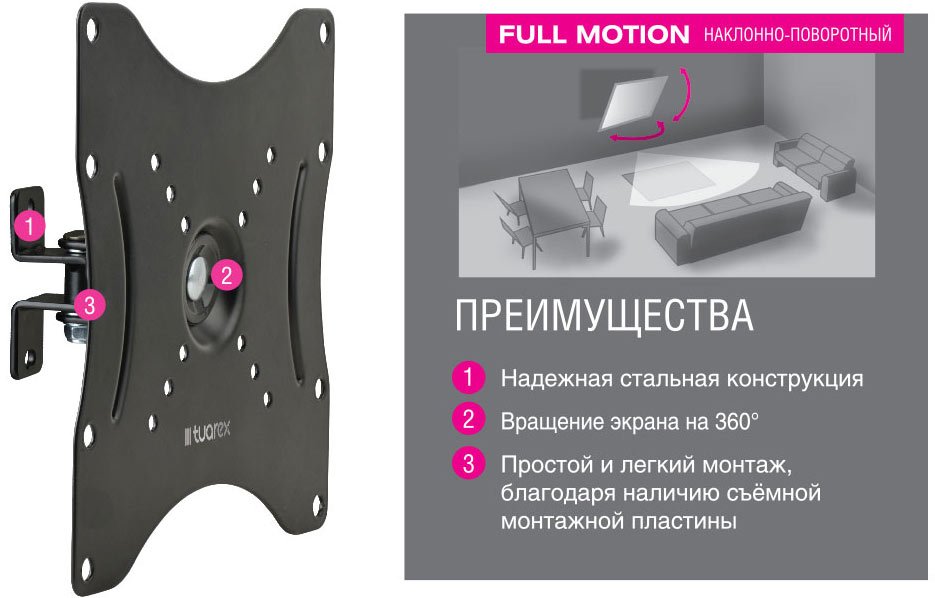 Для телевизора, установка: стена, Макс, диагональ: 42 ", Поворот , Наклон.