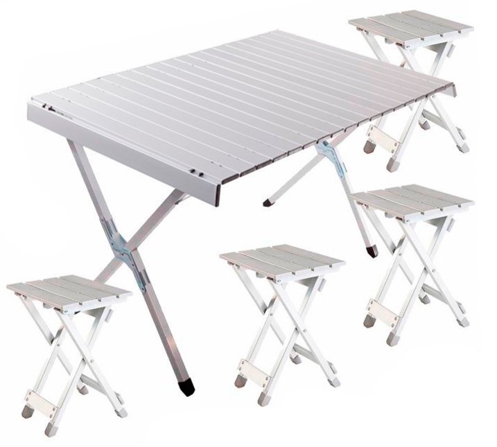 Набор складной мебели. Складной стол + 4 стула. Материал: алюминий. Размер стола в разложенном виде: 110x70x70 см. Размер стула в разложенном виде: 25x5,5x38 см.