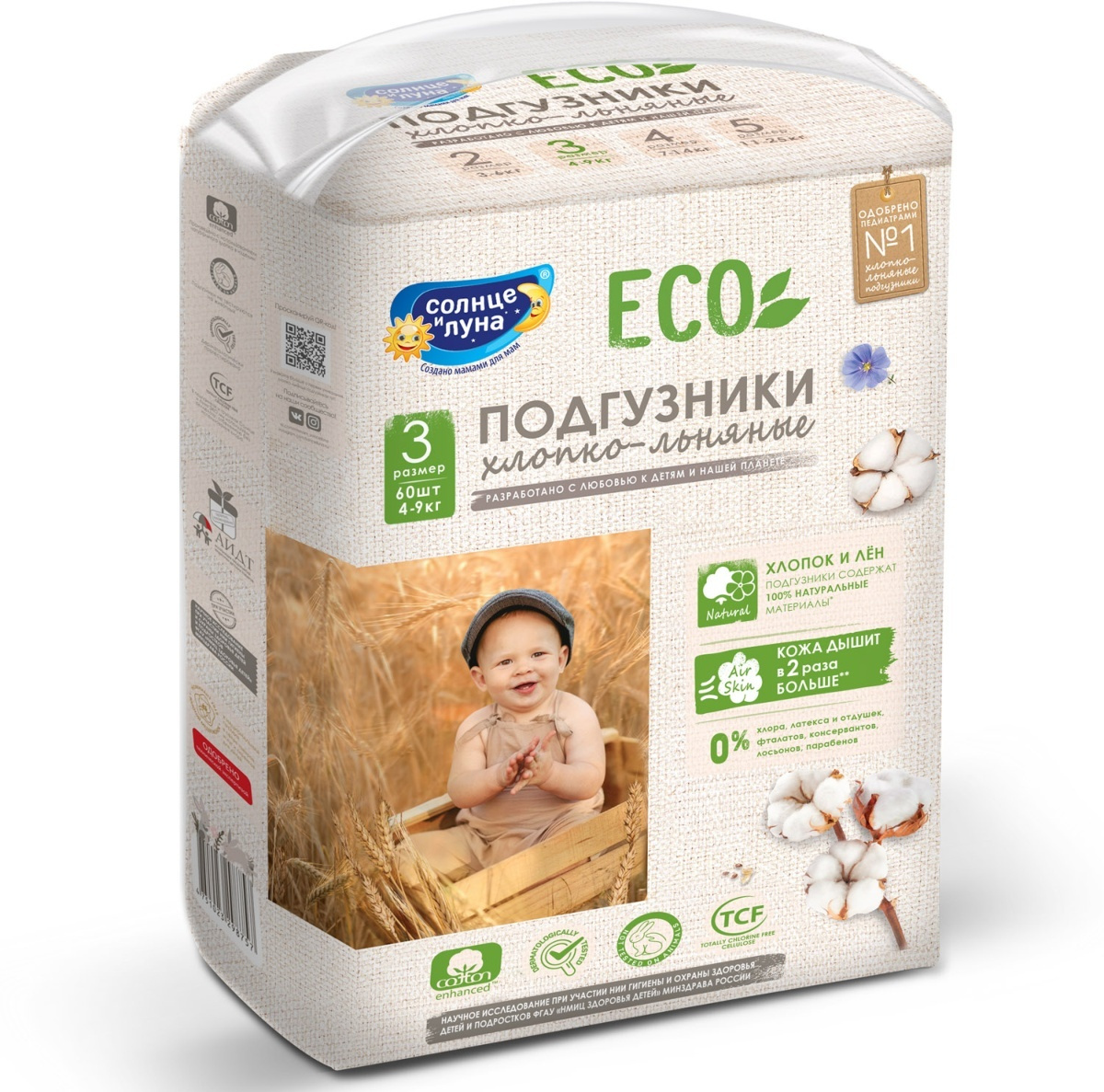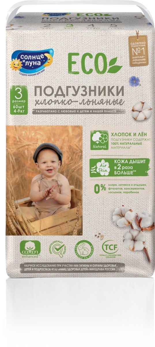 СОЛНЦЕ И ЛУНА ECO Подгузники одноразовые для детей 3/M 4-9 кг mega-pack 60шт КК/2