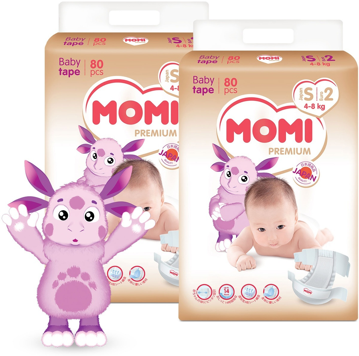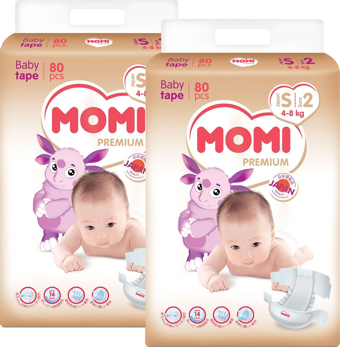 Подгузники Momi Premium, 4-8 кг, размер S, 80 шт х 2 упаковки