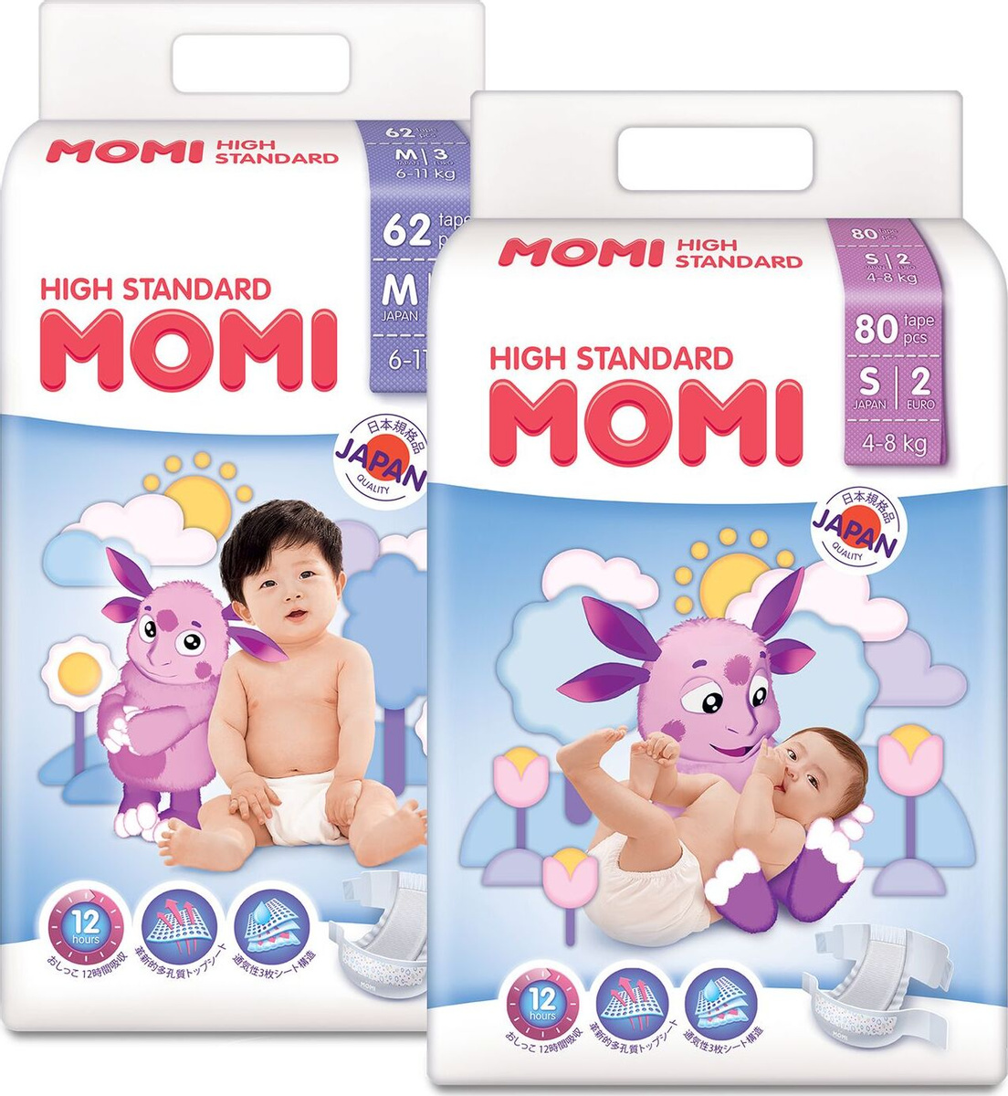 Подгузники Momi High Standard, 4-8 кг, размер S, 80 шт + 6-10 кг, размер M, 62 шт