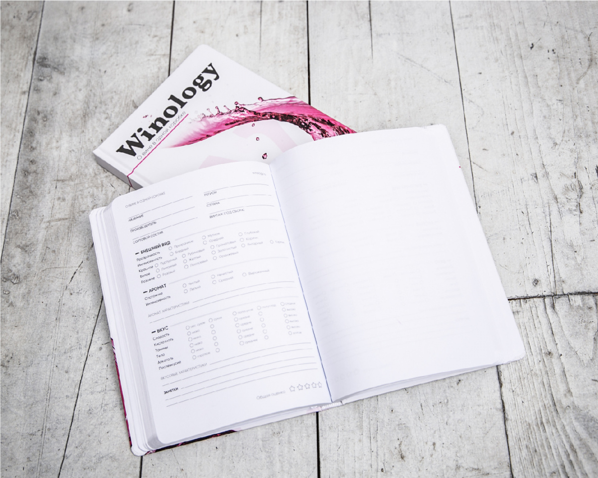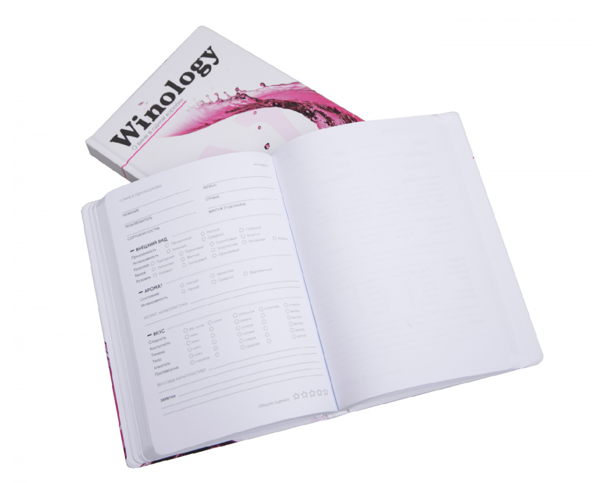 - Комплектация Блокнот со шпаргалкой по характеристикам вина, закладка ляссе, резинка.