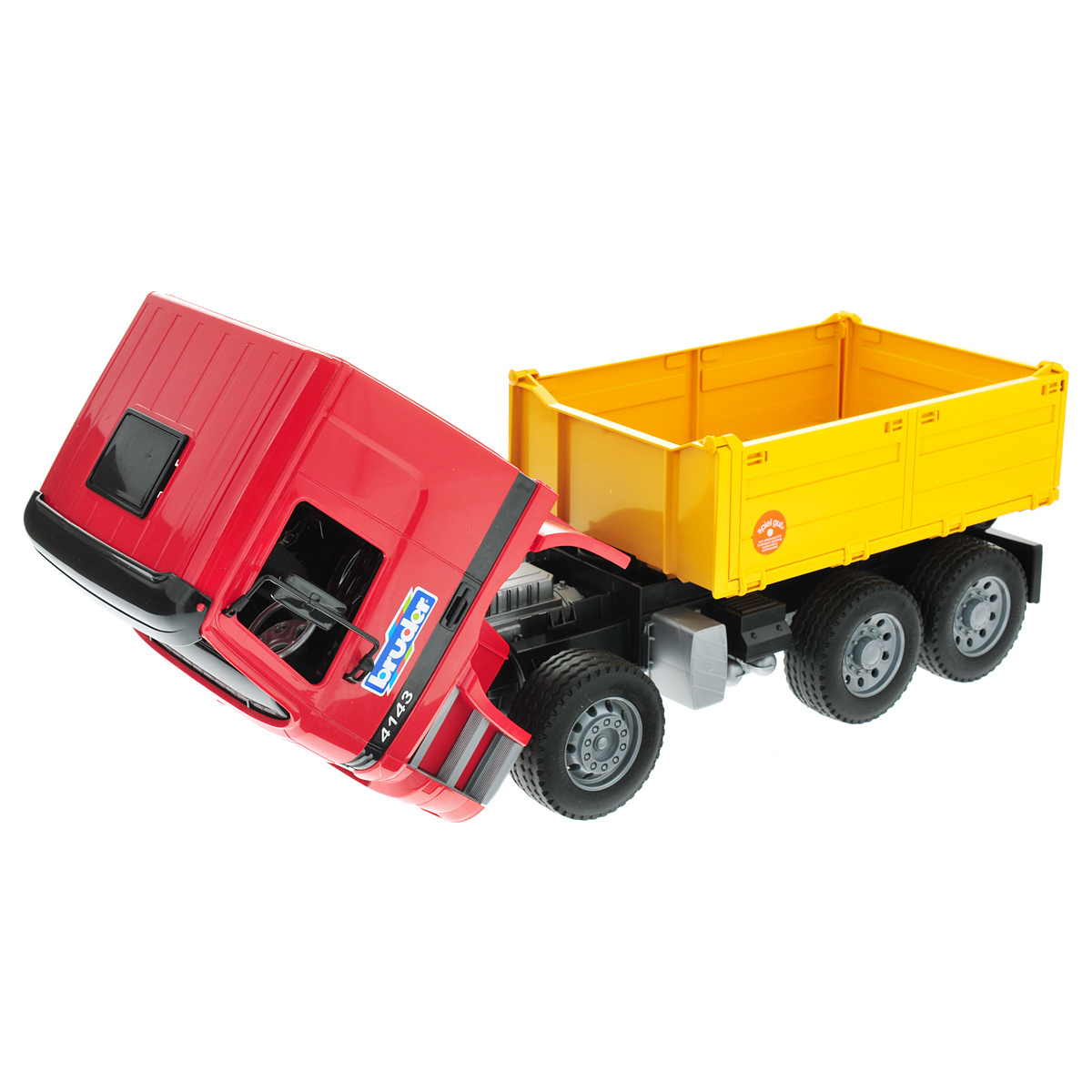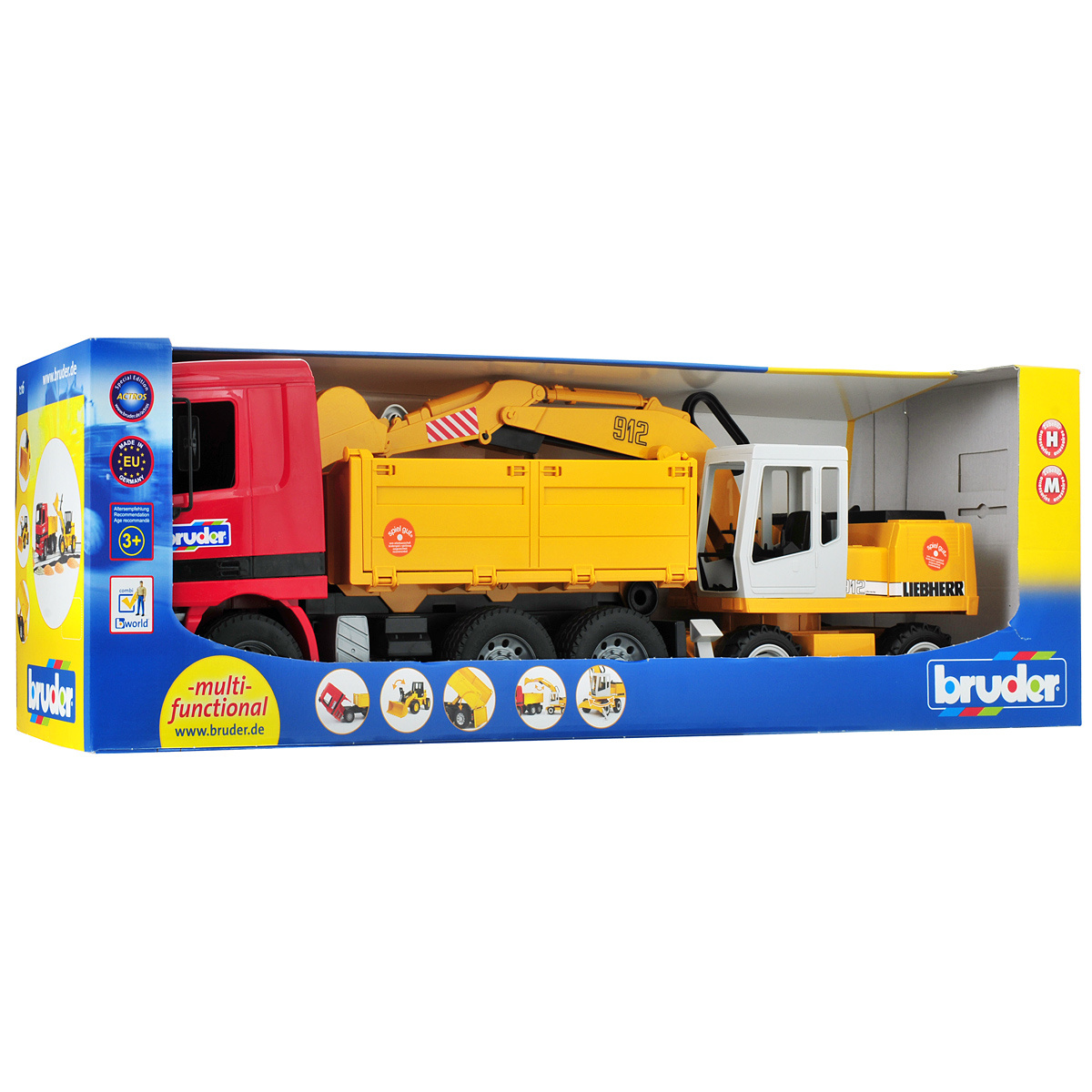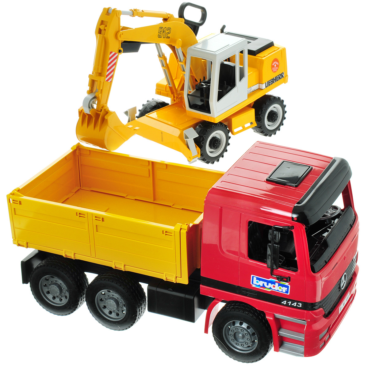 Bruder Самосвал "Mercedes-Benz", с колесным экскаватором, цвет: красный, желтый