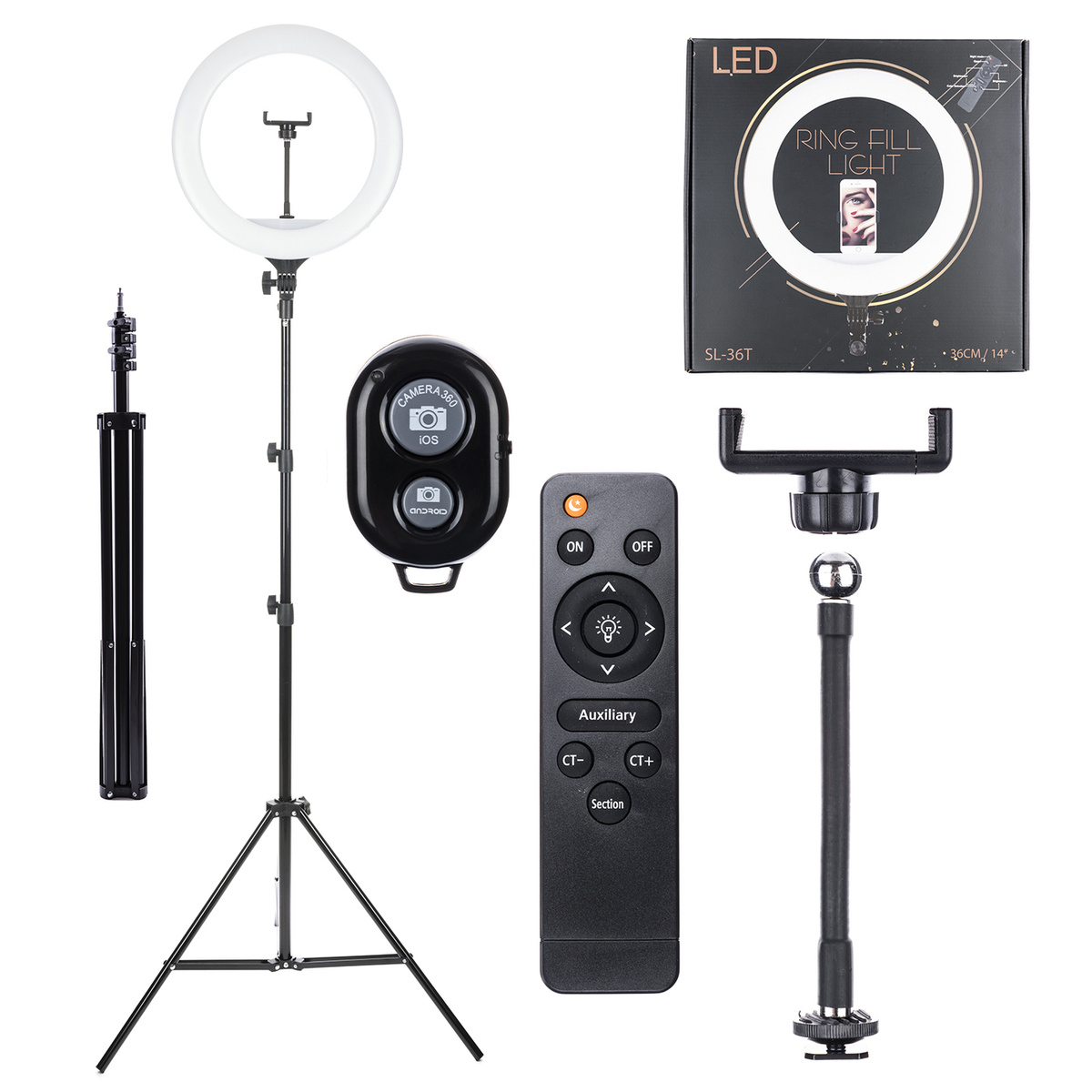 Кольцевая лампа AMAI 36см с пультом дистанционного управления, пультом для селфи Bluetooth, со штативом 210 см, с держателем для смартфона, сенсорным управлением