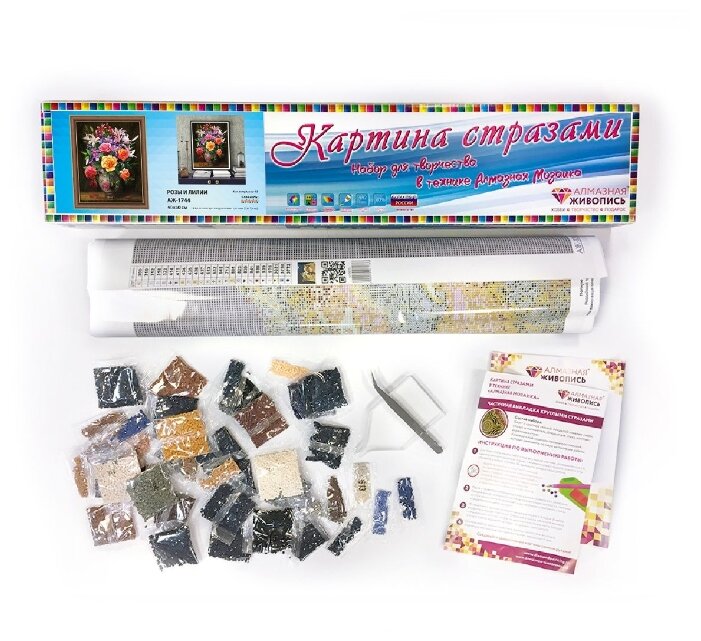 - Комплектация - акриловые квадратные стразы; - ткань с клеевой основой; - пластиковое блюдце; - стилус или пинцет; - инструкция.
