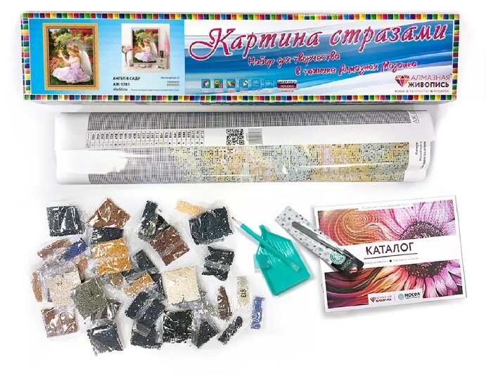 - Комплектация - акриловые квадратные стразы; - ткань с клеевой основой; - пластиковое блюдце; - стилус или пинцет; - инструкция.