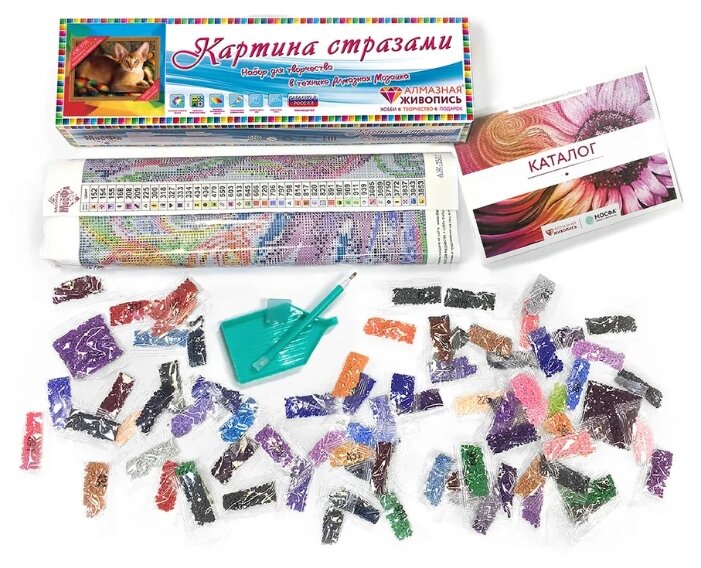 - Комплектация - акриловые квадратные стразы; - ткань с клеевой основой; - пластиковое блюдце; - стилус или пинцет; - инструкция.