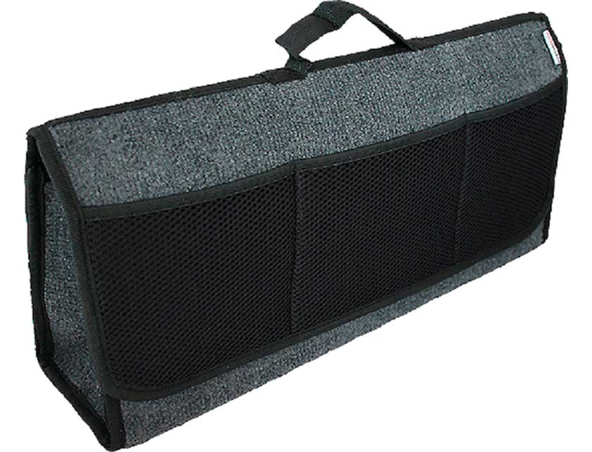 Органайзер с 3 карманами дает возможность удобно разложить беспорядочно разбросанные по багажнику предметы. Изготовлен из сверхпрочного материала — войлока. В органайзер можно поместить достаточное количество различных вещей. Крепится к тканевой обшивке багажника при помощи липучек. Предусмотрена прочная ручка для переноски. Размер — 500х240х120 мм. Общий объем — 15 литров, цвет — серый.