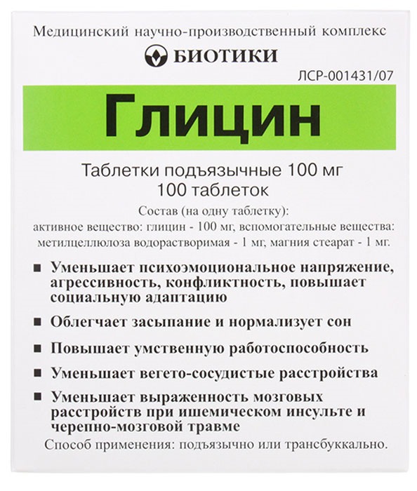 - Способ применения: Глицин применяется подъязычно или трансбуккально по 100 мг (в таблетках или в виде порошка после измельчения таблетки). Практически здоровым детям, подросткам и взрослым при психоэмоциональных напряжениях, снижении памяти, внимания, умственной работоспособности, задержке умственного развития, при девиантных формах поведения Глицин назначается по 1 таб. 2-3 раза/сут в течение 14-30 дней.При функциональных и органических поражениях нервной системы, сопровождающихся повышенной возбудимостью, эмоциональной лабильностью и нарушением сна, детям до трех лет назначают по 0.5 таб. (50 мг) на прием 2-3 раза/сут в течение 7-14 дней, в дальнейшем по 50 мг 1 раз/сут 7-10 дней. Суточная доза - 100-150 мг, курсовая — 2000-2600 мг. Детям старше 3 лет и взрослым назначают по 1 таб. 2-3 раза/сут, курс лечения 7-14 дней. Курс лечения можно увеличить до 30 дней, при необходимости курс повторяют через 30 дней.При нарушениях сна Глицин назначают за 20 минут до сна или непосредственно перед сном по 0.5-1 таб. (в зависимости от возраста).При ишемическом мозговом инсульте: в течение первых 3-6 ч от развития инсульта назначают 1000 мг трансбуккально или подъязычно с одной чайной ложкой воды, далее в течение 1-5 суток по 1000 мг/сут, затем в течение последующих 30 суток 1-2 таб. 3 раза/сут.В наркологии Глицин применяется в качестве средства, повышающего умственную работоспособность и уменьшающего психоэмоциональное напряжение в период ремиссии при явлениях энцефалопатии, органических поражениях центральной и периферической нервной системы по 1 таб. 2-3 раз/сут в течение 14-30 дней. При необходимости курсы повторяют 4-6 раз в год.