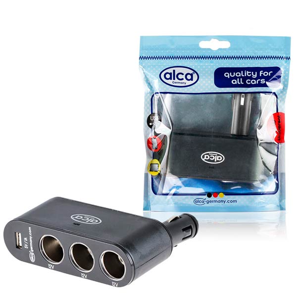 Переходник прикуривателя ALCA 510/2 черного цвета с тремя разъемами на 12 В и возможностью присоединения USB кабеля. Применяется для зарядки электронных устройств в дороге через USB кабель и автомобильные зарядные устройства. Переходник вставляется в прикуриватель и работает при напряжении 12 В. USB кабель в комплект не входит.