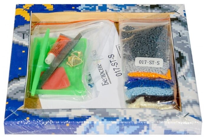 - Комплектация - холст на подрамнике с листом оргалита; - комплект квадратных страз; - пинцет; - лоток; - пластмассовый карандаш для камней; - жидкий клей.