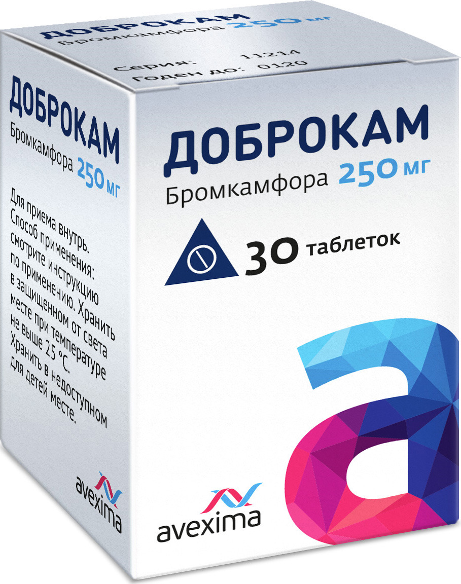 - Состав Состав: 1 таблетка содержит: активное вещество: бромкамфора- 250 мг; вспомогательные вещества: крахмал картофельный - 41 мг, тальк - 9 мг.