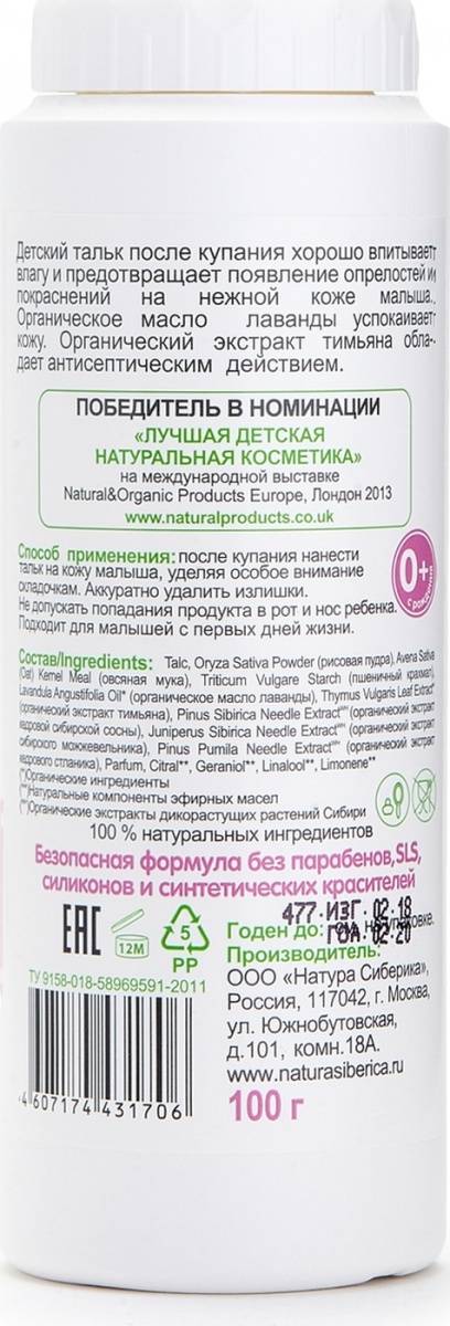 - Состав: Talс, Oryza Sativa Powder (рисовая пудра), Avena Sativa (Oat) Kernel Meal (овсяная мука), TritiСum Vulgare StarСh (пшеничный крахмал), Lavandula Angustifolia Oil* (органическое масло лаванды), Thymus Vulgaris Leaf ExtraСt* (органический экстракт тимьяна), Pinus SibiriСa Needle ExtraСtWH (органический экстракт кедровой сибирской сосны), Juniperus SibiriСa Needle ExtraСtWH (органический экстракт сибирского можжевельника), Pinus Pumila Needle ExtraСtWH (органический экстракт кедрового стланика), Parfum, Сitral**, Geraniol**, Linalool**, Limonene**. * - органические ингредиенты. ** - натуральные компоненты эфирных масел. WH - органические экстракты дикорастущих растений Сибири.