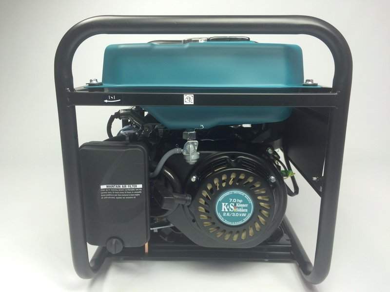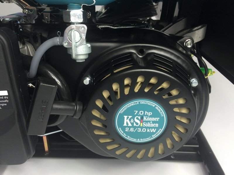 Специальная разработка бензиновых двигателей внутреннего сгорания под логотипом Könner & Söhnen важная особенность данной модели генератора. Поршневой двигатель развивает рабочую мощность до 2,6 кВт, с возможной кратковременной мощностью в 3 кВт. Рабочий объем цилиндра 208 см3. Поршневой двигатель не только оснащен системой, благодаря которой снижен уровень отработанных газов, но и имеет пониженный уровень звукового давления 69 дБ. Верхнее расположение клапанов 4-х тактного мотора характеризуется экономичным потреблением топлива. Двигатель имеет воздушное охлаждение, которое снижает тепловую нагрузку и обеспечивает максимальную производительность. Защитная металлическая рама, на которой установлены вибропоглощающие подушки, обеспечивает минимальный уровень вибрации и продлевает рабочий ресурс агрегата.