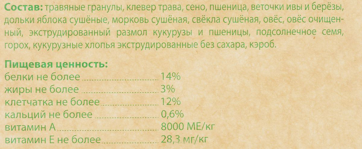- Состав Клевер, Сено, Пшеница, Яблоко, Морковь, Свекла, Овес, Кукуруза, Подсолнечник, Горох